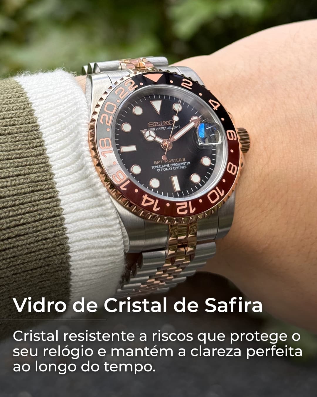 Feito em Aço Inoxidável 316L e Cristal de Safira para verdadeira durabilidade e elegância.